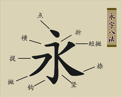 笔画指汉字书写时不间断地一次连续写成的一个线条,是构成汉字的最基本元素。笔画可分为横(一)、竖(丨)、撇(丿)、点(丶)、捺(㇏)、折(亅)等几类,具体细分可达30多种。有没有一个包含所有笔画的字呢?当然有,就是“永”字。“永”字有八笔:点、横、竖、勾、仰横、撇、斜撇、捺,按各自的笔势以八字概括为侧、勒、努、趯、策、掠、啄、磔,被概括为永字八法。这八笔是楷书基本笔划,每笔各有特色,而又互相呼应,一气呵成。“永”字如果能写出每笔的精神,楷书可算达到相当水平。
